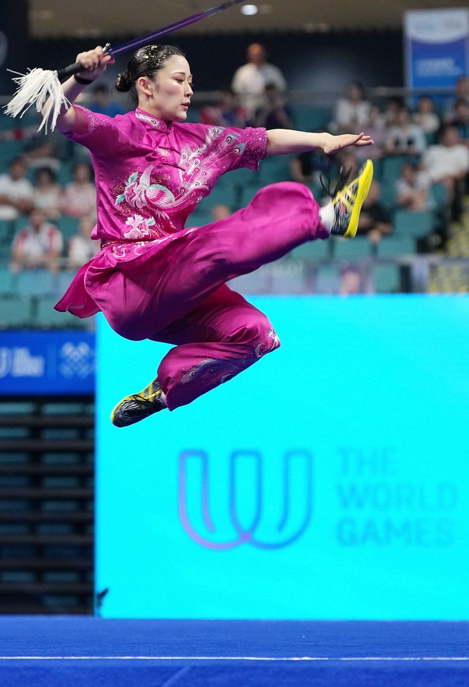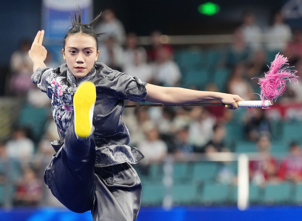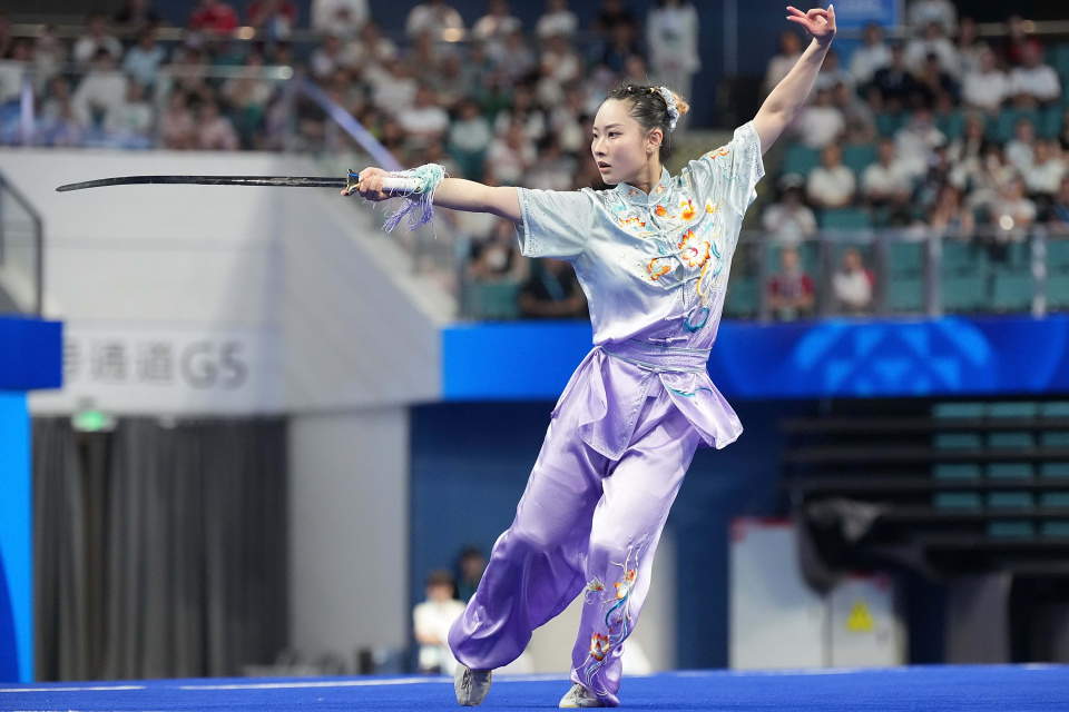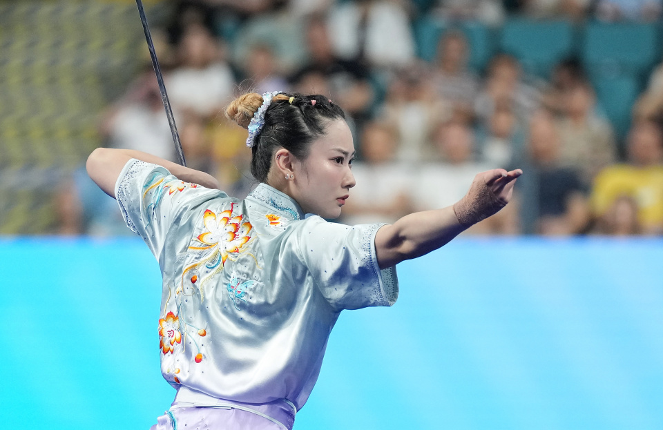 当日,2025年成都世运会女子长拳-剑术-枪术决赛举行。8月9日,马来西亚选手彭牬尔在剑术比赛中。最终,她获得亚军。新华社记者 徐速绘 摄