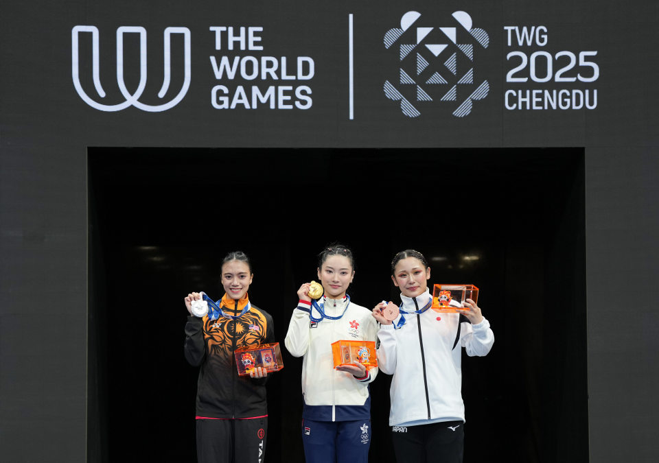 8月9日,冠军中国香港选手沈晓榆(中)、亚军马来西亚选手彭牬尔(左)和季军日本选手贵田菜花在颁奖仪式上。新华社记者 徐速绘 摄